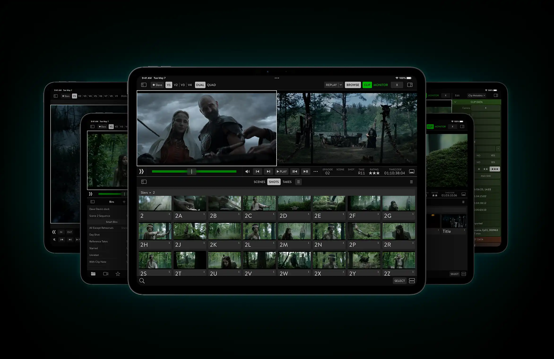 Playback features include multiple clip ranges, synchronized views of multiple cameras, scrubbing, and frame-by-frame review, giving creative teams precise technical control over every take, including framing, masks and scopes.